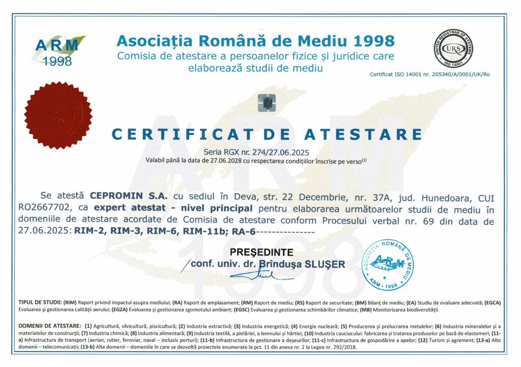 - Asociația Română de Mediu 1998 – Certificat de atestare Seria RGX nr. 274/27.06.2025 – Expert atestat – nivel principal pentru studii de mediu: RIM-2, RIM-3, RIM-6, RIM-11b, RA-6, Seria RGX nr.714/12.06.2025 – Expert atestat – nivel principal pentru studii de mediu: RM-13b;